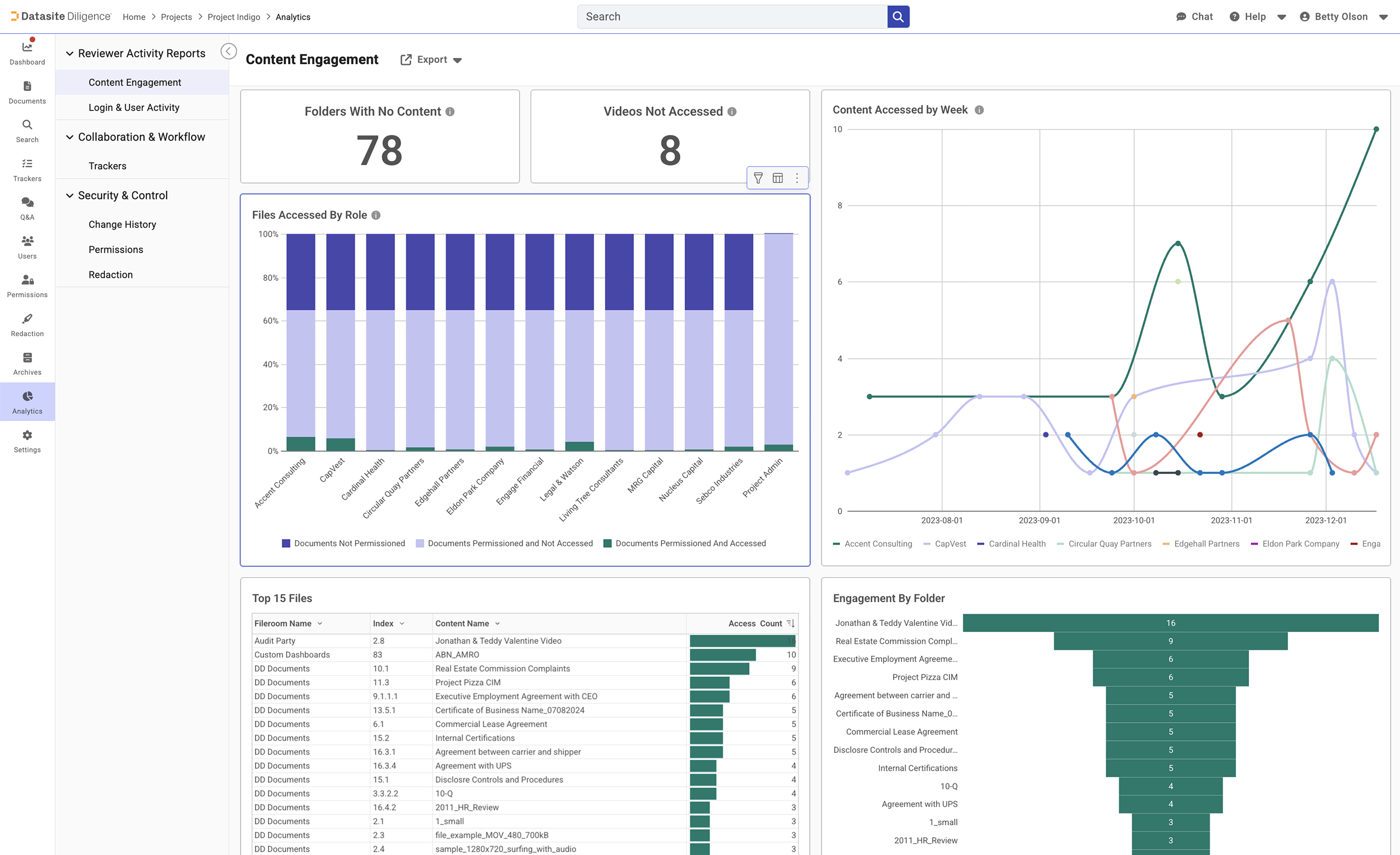 The software provides insights into deal engagement through its analytics. A Project Dashboard offers a consolidated view of all activity. At the same time, detailed reports track user interaction on a granular level, helping to identify key areas of interest or potential risks.