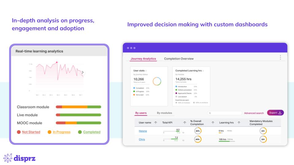 Disprz’s action-triggered automated workflows reduce manual effort in managing learning processes. This platform’s detailed performance analytics provide valuable insights into training effectiveness. By optimizing workflows and leveraging analytics, organizations can enhance efficiency, identify areas for improvement, and drive continuous learning and development initiatives.