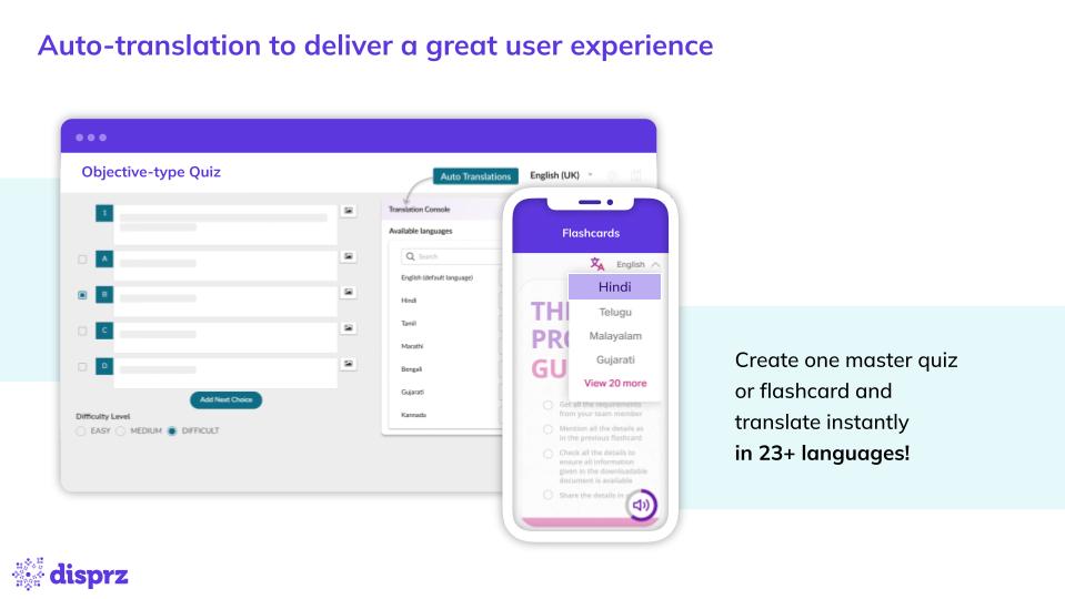 Disprz ensures that learning content meets the diverse needs of learners worldwide with auto-translate functionality to 23+ languages. This feature enhances engagement and comprehension by enabling organizations to overcome language barriers and maximize the effectiveness of their training initiatives.