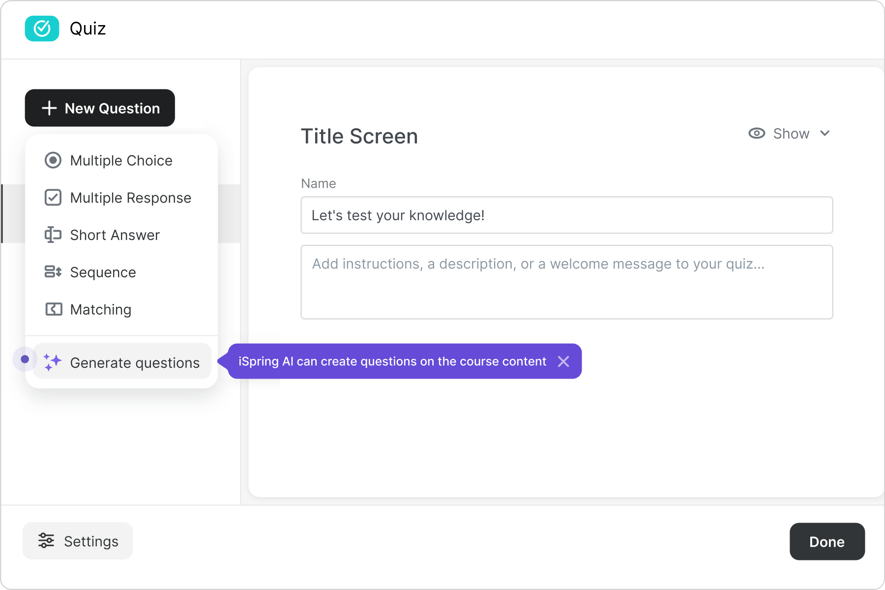 Uploading your e-courses straight to iSpring LMS can be done with just one click. The system supports SCORM packages, HTML5, audio/video files, and more. You can also incorporate games and quizzes into your courses.