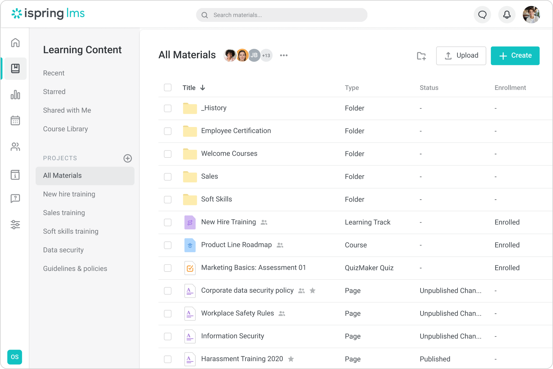 iSpring LMS is a simple yet effective learning management system designed for teaching and assessing employees or students online. As this LMS requires little to no learning curve, educators and facilitators can quickly upload their learning materials to the platform. iSpring LMS also provides learners with quick and simple access to their courses. Furthermore, all users can create and upload their learning materials to their accounts, giving them full control of their learning experience.