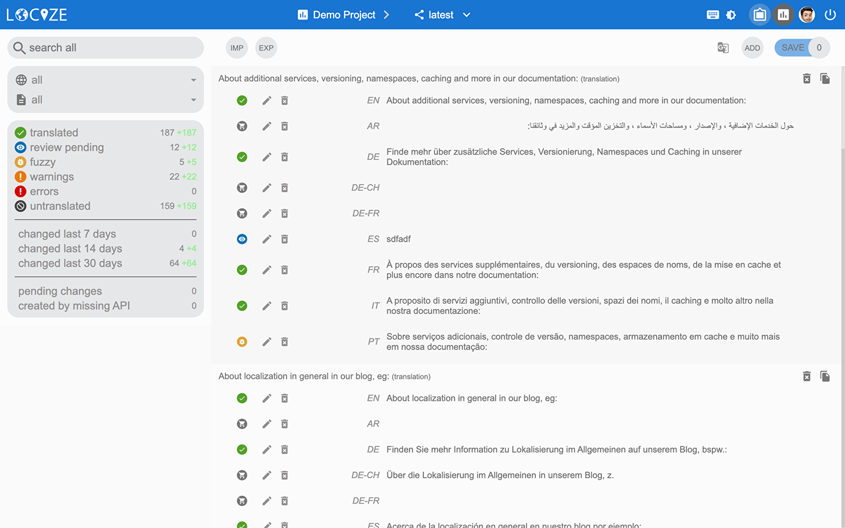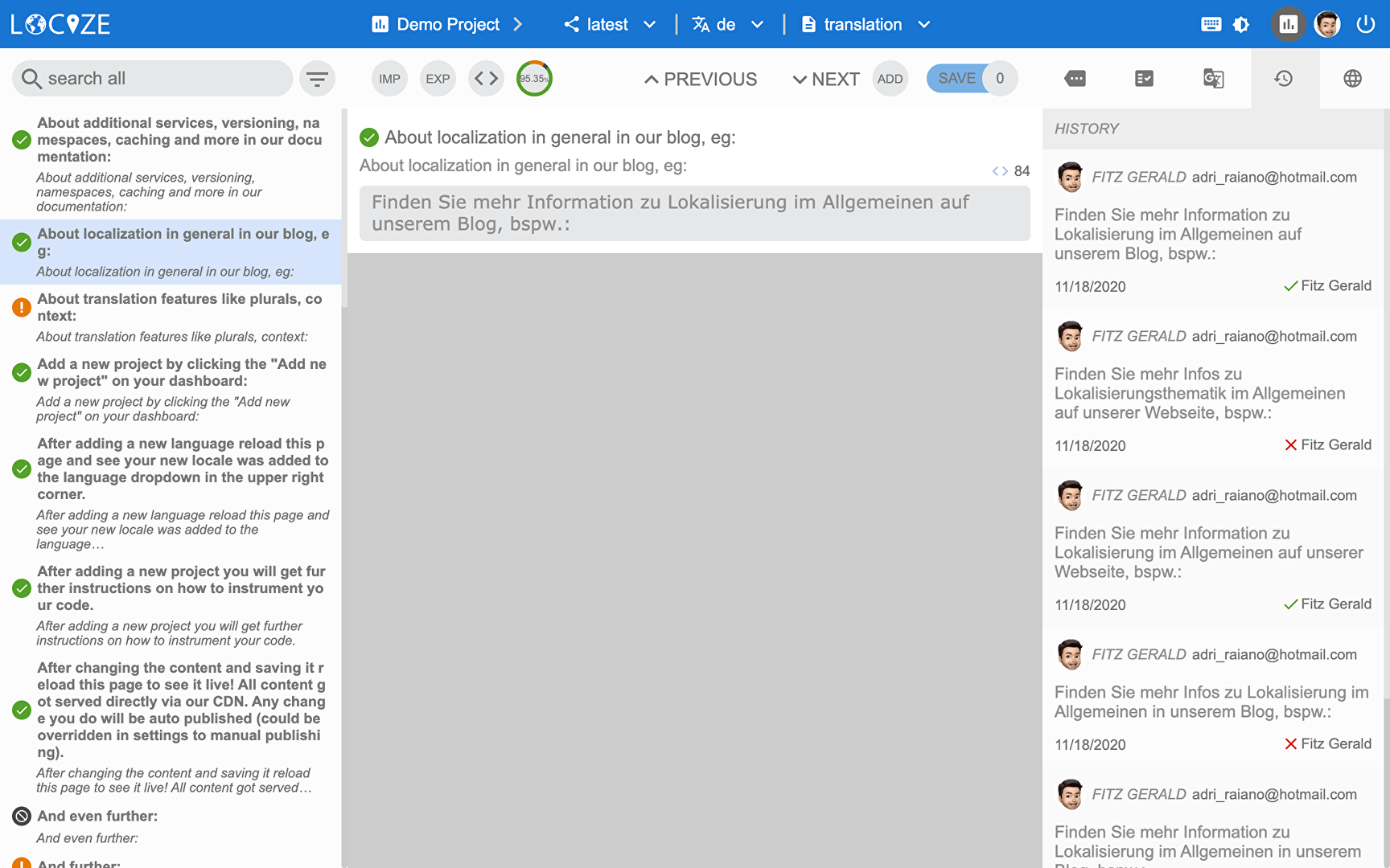 The locize solution is equipped with a versioning feature. This is especially beneficial for big cloud projects for keeping track of the changes made on the website.