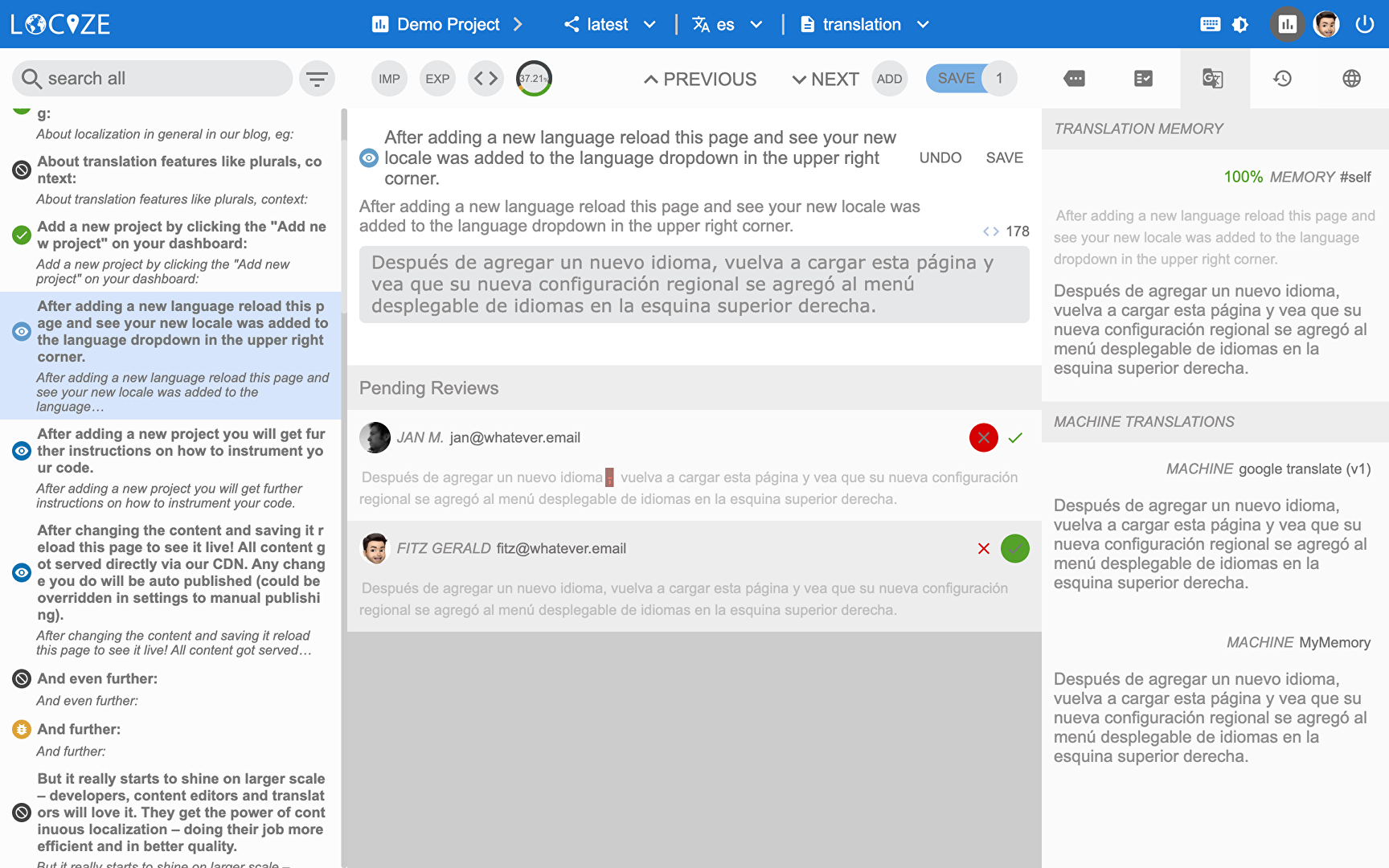 With locize, translation and development are kept separate. The localization team works continually on translating content and keeps up with the changes with ease. This makes it easier for you to update translations without publishing an update for your app. Moreover, you also get a full overview of the entire process. As such, you can see exactly what has been localized and what has not for you to review your translators’ efforts.