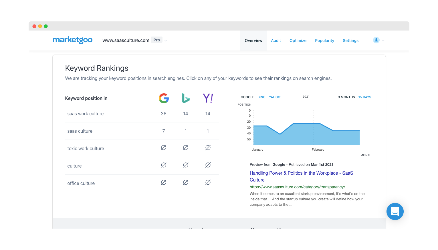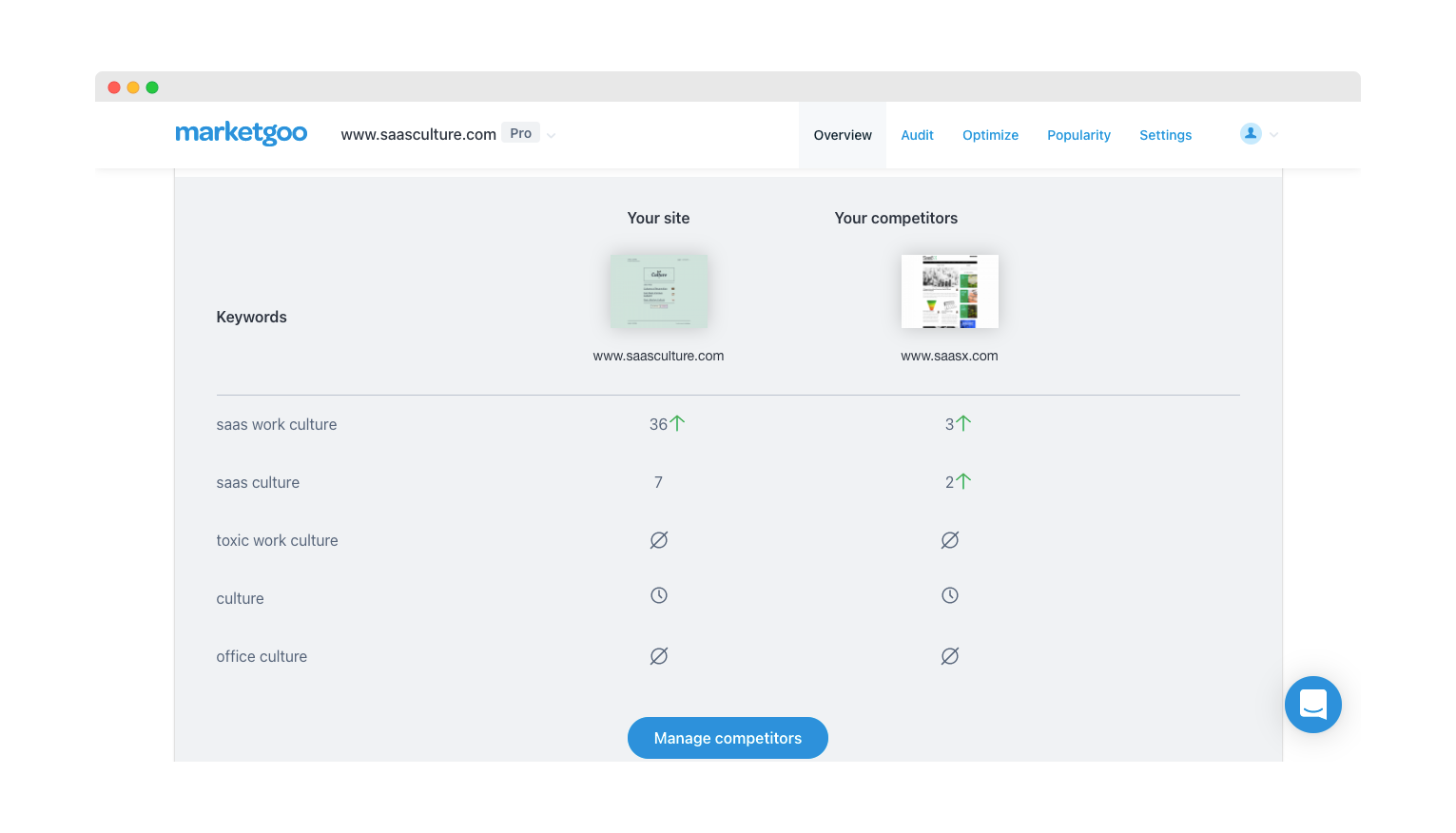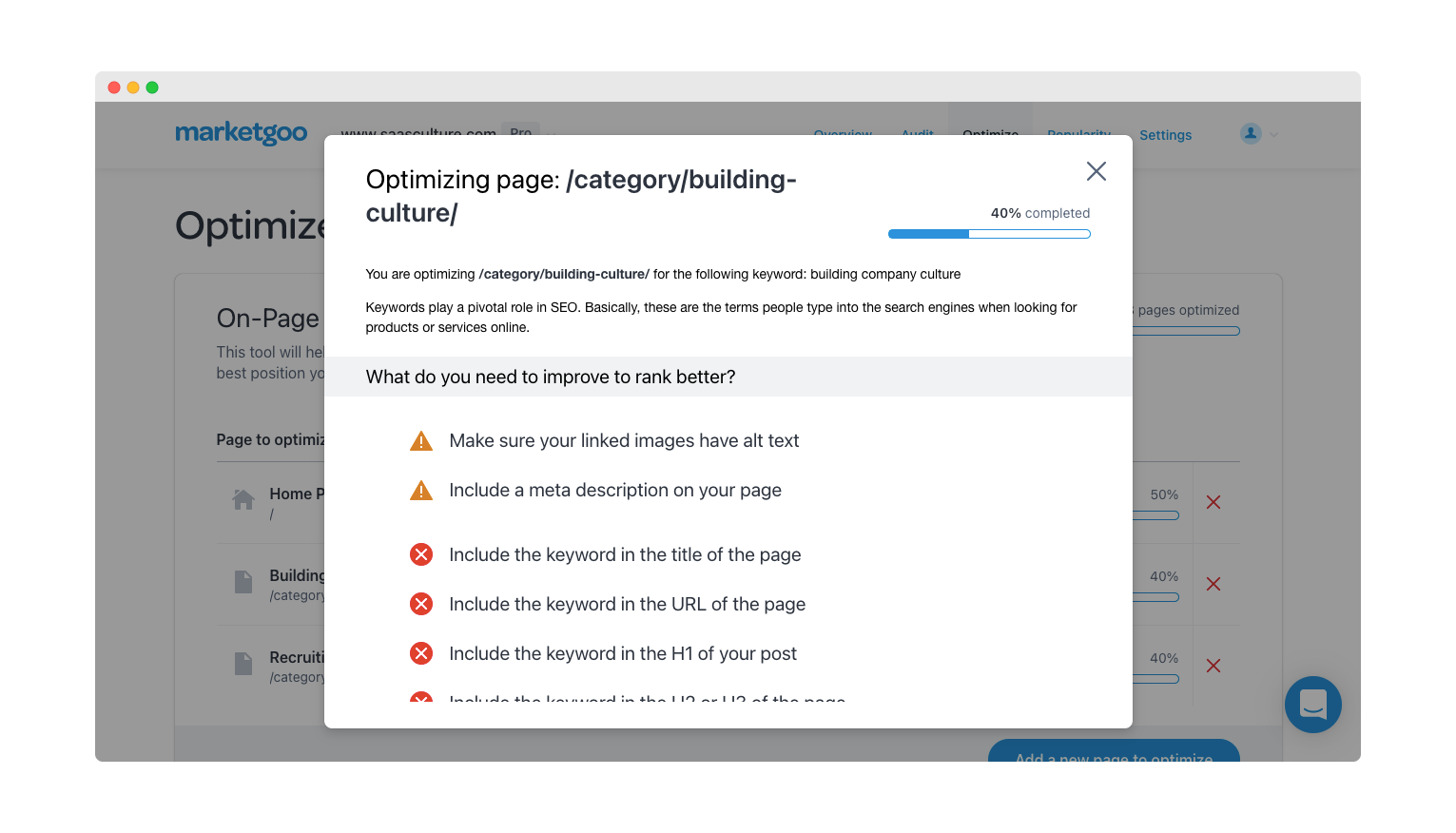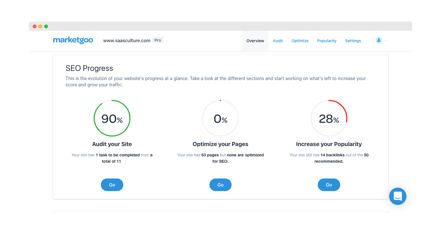 marketgoo helps small businesses grow and achieve online success by providing easy, guided SEO tools to help increase traffic and search rankings.