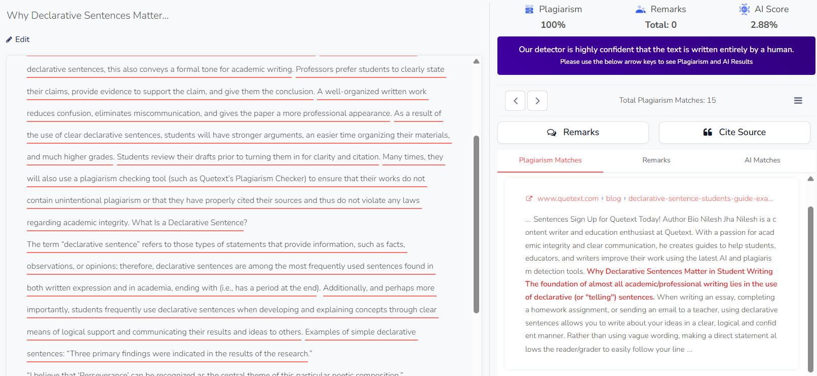 Solution: Quetext addresses this by using contextual analysis to identify both direct duplicates and partial matches in which words have been rearranged. This allows users to pinpoint and revise specific sections, ensuring the final submission is unique and properly attributed.