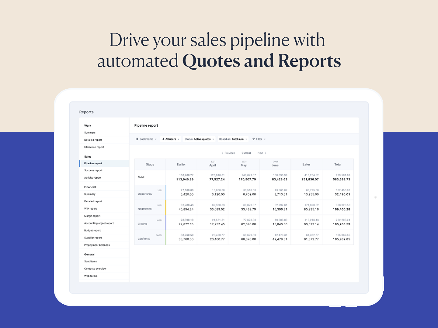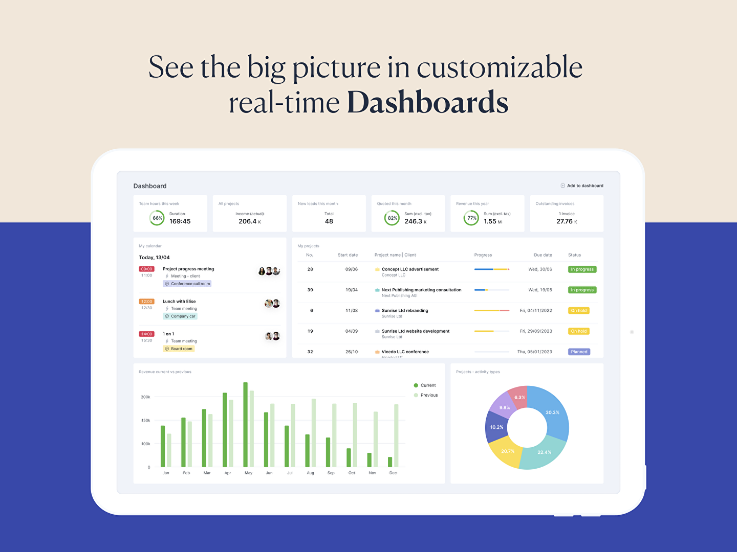 Ideal for rapidly growing businesses, Scoro’s Pro package enables you to track everything with fully customizable dashboards, as well as financial and sales reports.