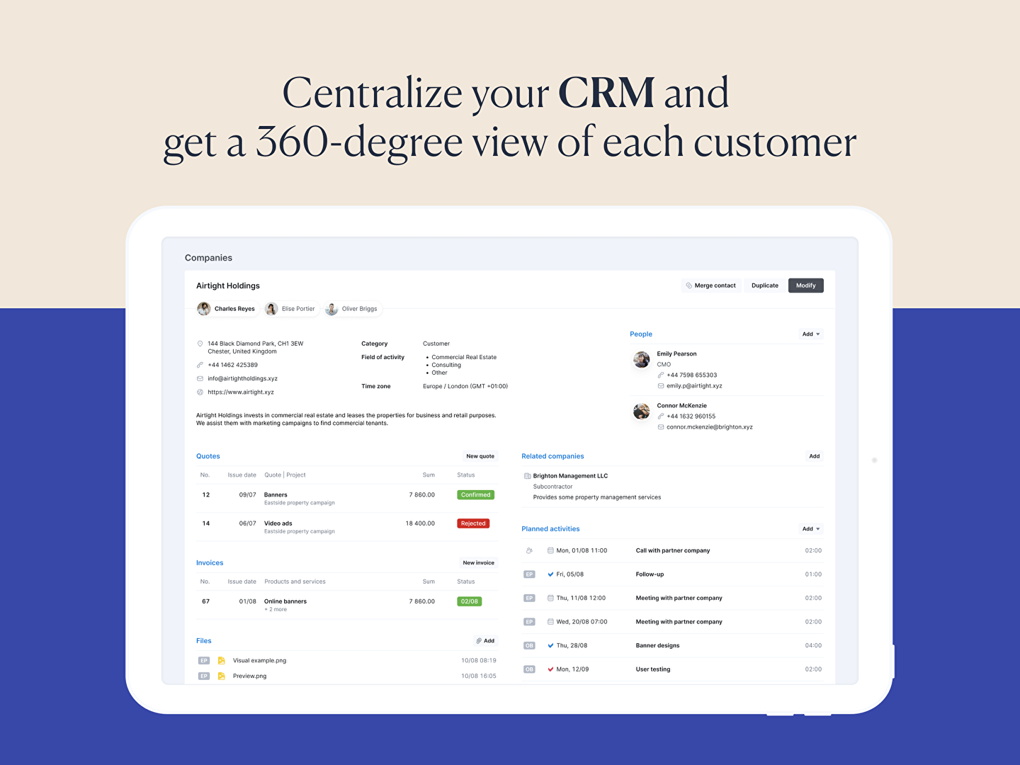 The software’s key feature is its control hub, from which tasks, account information, key performance data and calendar events, among other aspects of businesses are displayed. This, along with the solution’s user-friendly interface makes working with the platform a breeze even for first time users. The application also provides localized solutions, offering country specific integrations for the European market.