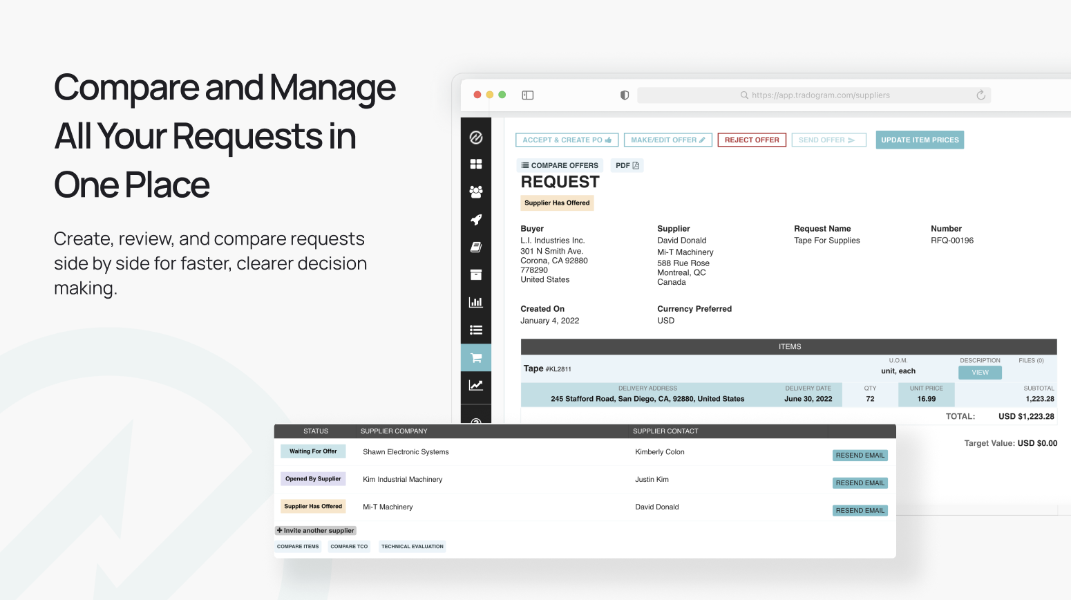 Tradogram users can negotiate with their suppliers right through the system, using simple Request forms. Their suppliers don’t need to signup or need training on how to submit their offers online. Easily communicate your needs to your suppliers without any of the traditional ways of emails and phone calls.