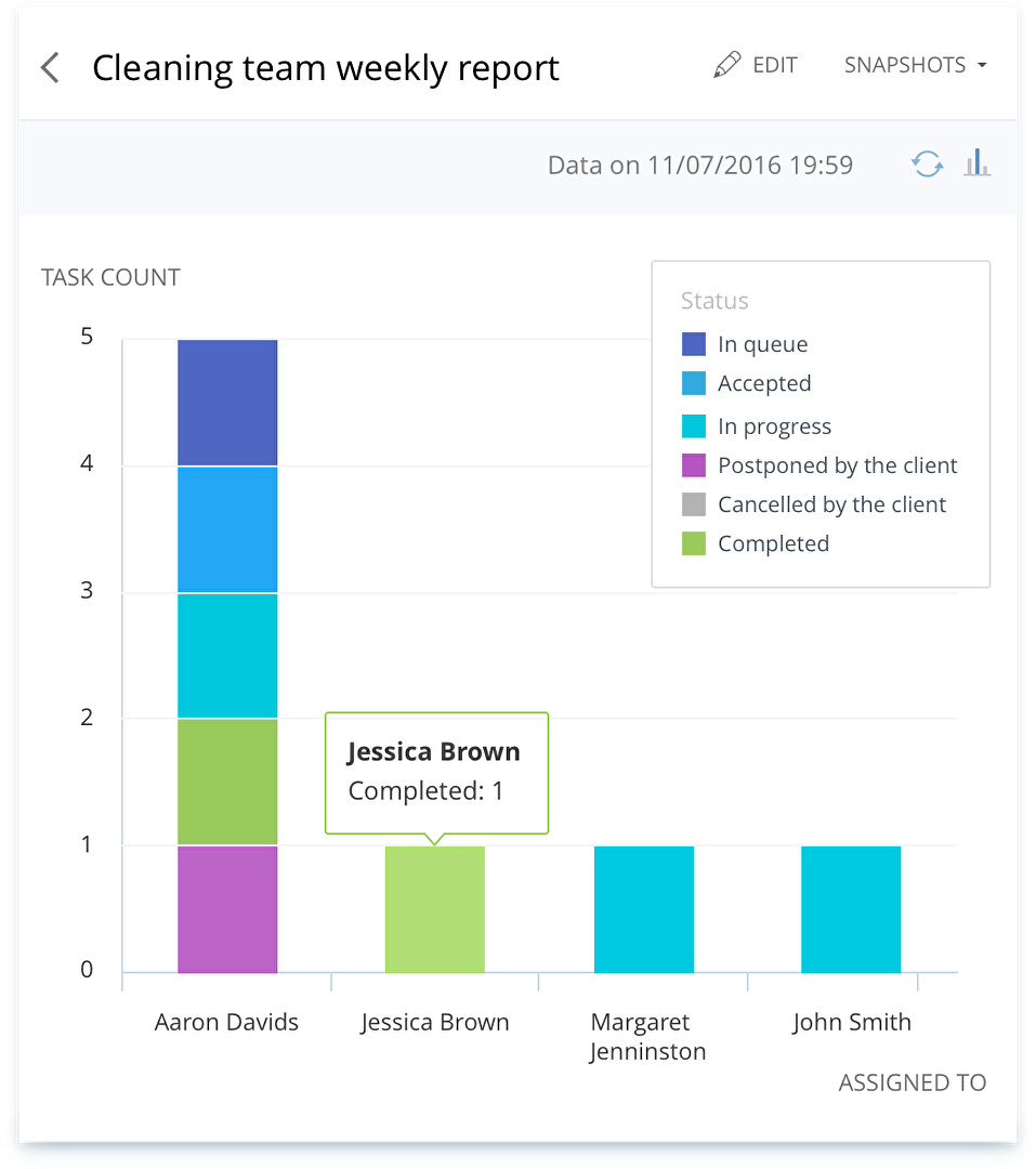 Field workers no longer have to come to your office just to take requests as this can be time-consuming. Instead, Wrike empowers your workers to access the corresponding dashboard right from their smartphone. It gives them a quick view of tasks they have to accomplish and update its status to “in progress” during execution. All information regarding a particular issue is gathered in task view to make it easy for the worker to see request details. During execution, the worker can start the built-in time tracker and attach any files and photos from the client as needed. Once the work is completed, managers will see on the dashboard as the status changes.