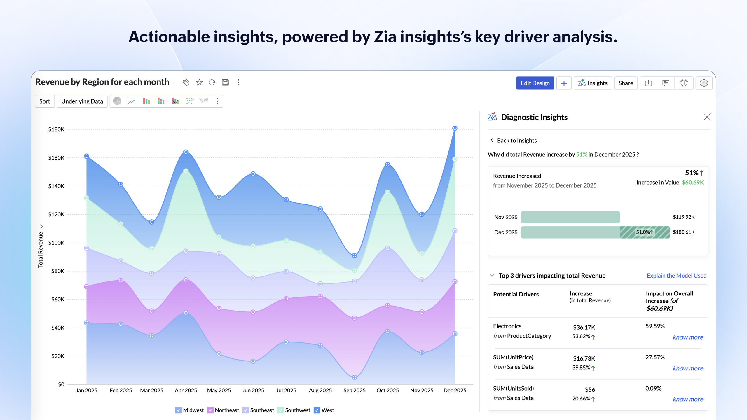 Zoho Analytics gives you a bird’s-eye view of your organization’s health and performance across various departments by consolidating data from different sources. Users can then utilize this data to drill down into reports through visualizations and building reports and dashboards. And technical skills aren’t required due to its drag-and-drop editor.